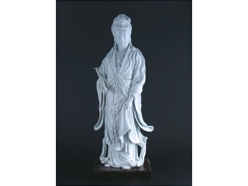 A massive Chinese blanc de Chine model of Guanyin, the Goddess of Mercy, standing holding a sceptre wearing flowing robes, raised on a wood stand, p'u-chi y impressed to the reverse. Minor repairs. 19th century, 57cm. (2)