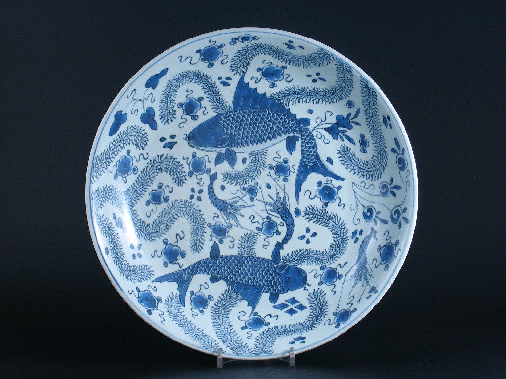 A Chinese blue and white dish, boldly painted with two large scaly carp and three shrimps amidst waterweed, the reverse with a fungus mark within a channelled footrim, Kangxi 1662-1722, 35cm.