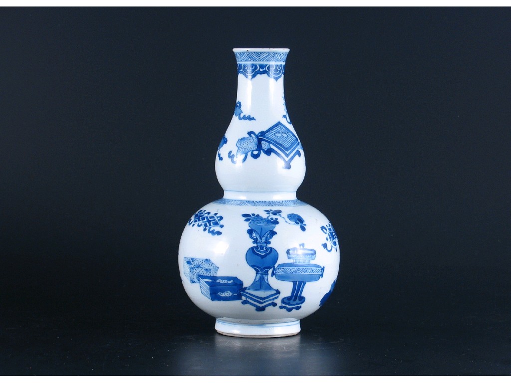 A Chinese blue and white double gourd vase, painted with vases of flowers and auspicious objects, unmarked, Kangxi 1662-1722, 23.5cm.