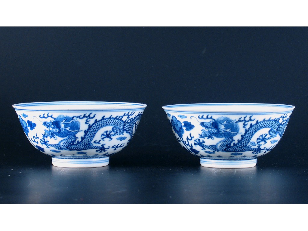 A pair of Chinese blue and white dragon bowls. One cracked. Guangxu six character marks and of...