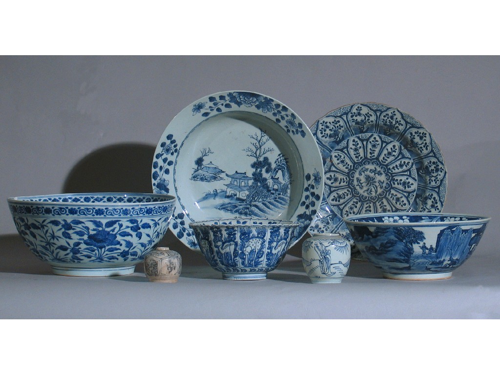 Chinese blue and white porcelain, variously decorated with flowers, figures and landscapes, comprising: three bowls, a basin, a dish and two small jars. Damages. 17th century and later, 38.5cm. (7)