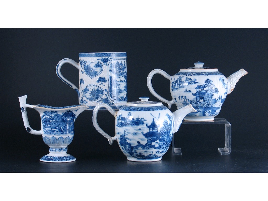 Two Chinese blue and white teapots and covers, a blue and white cylindrical mug and a helmet ewer, all decorated with pagoda landscapes. Some damage. All 18th century, 14cm. Max. (6)