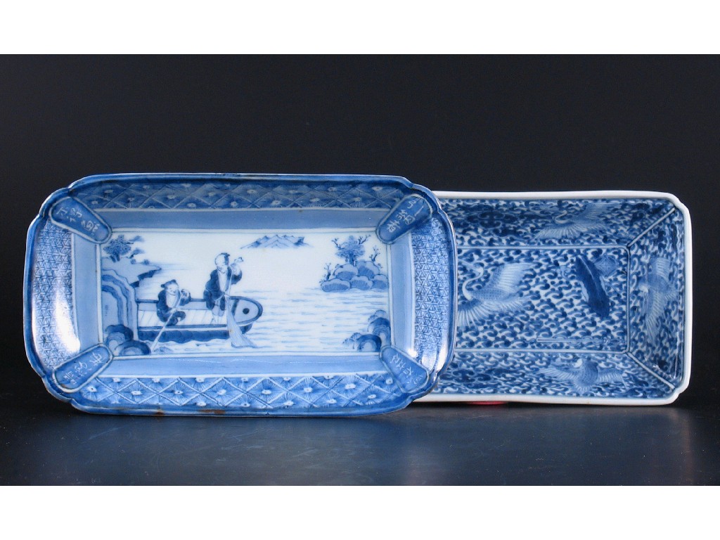 Two Japanese blue and white rectangular dishes, one decorated with two figures in a boat, the other with herons and fish. One with a small rim chip. 19th/early 20th century, 21cm. (2)