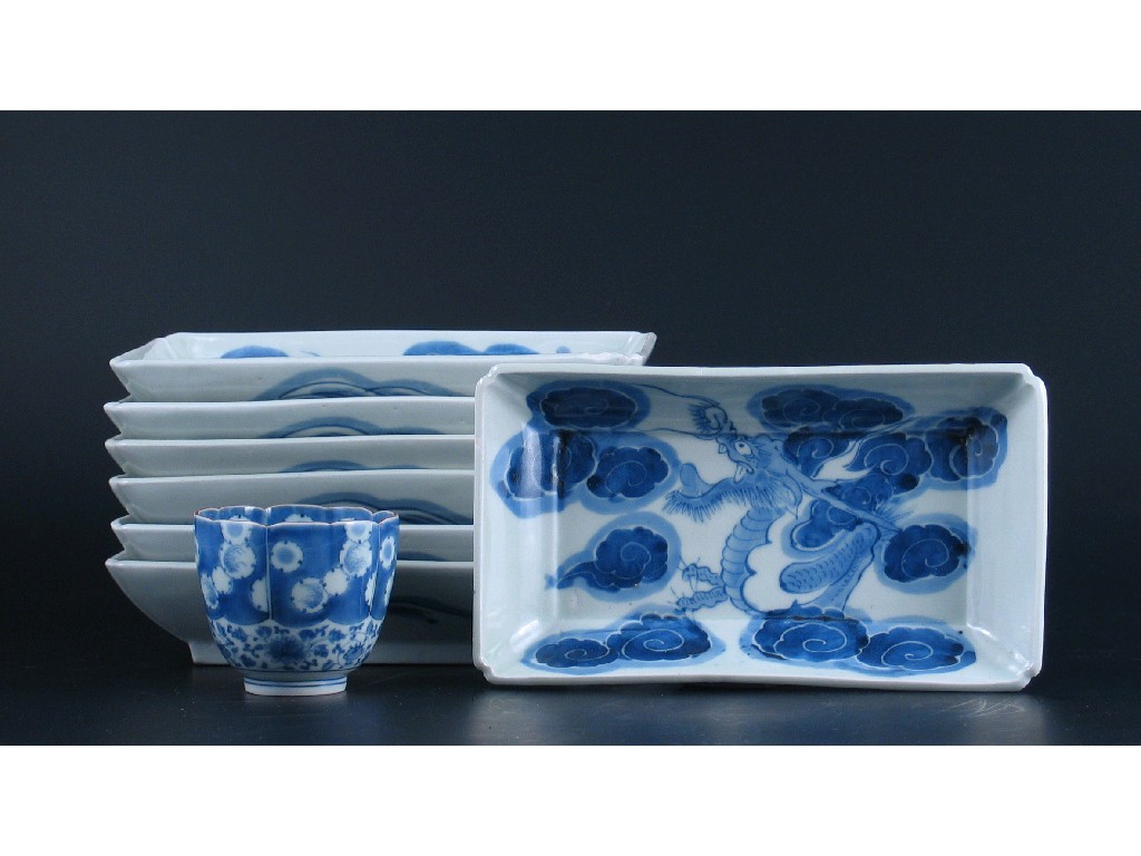 A set of seven Japanese blue and white rectangular dishes, painted with dragons amidst cloud scrolls and a small Japanese blue and white bowl, all 19th century, 21cm. (8)