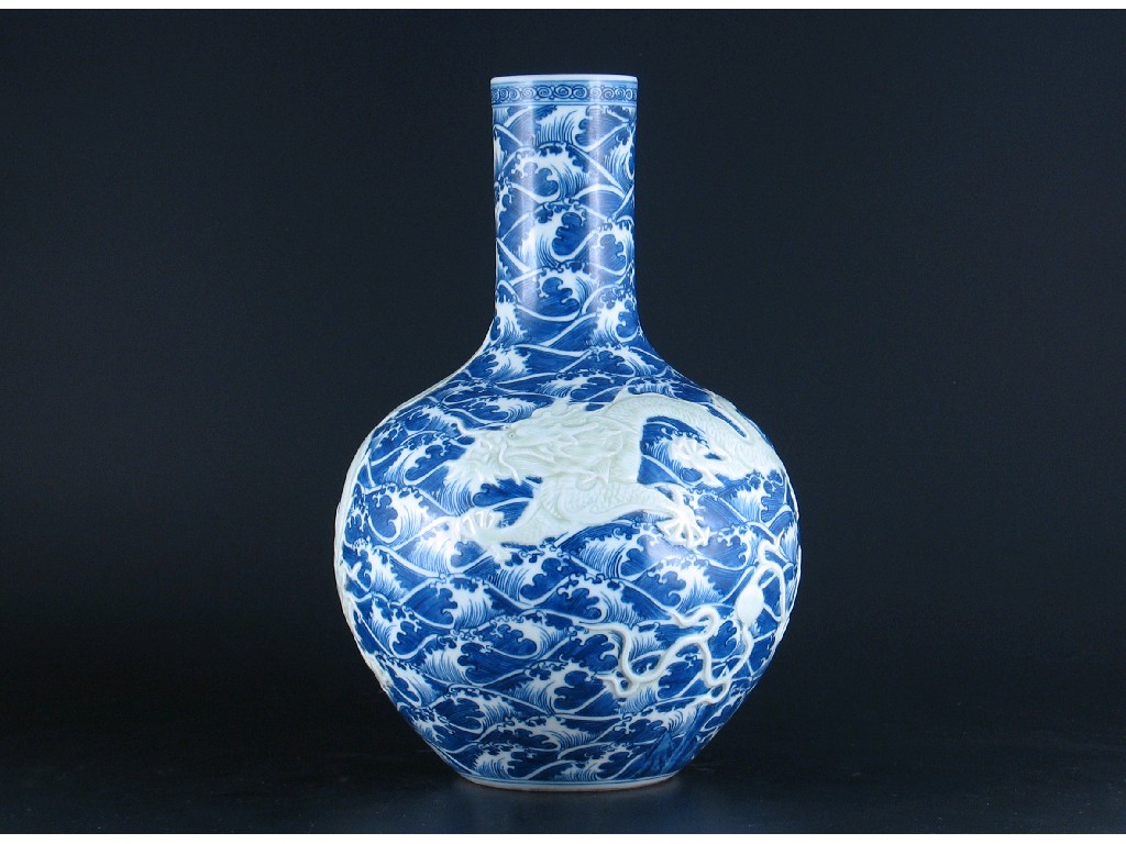 A Chinese blue and white vase, moulded with three dragons in pursuit of a flaming pearl, on a ground of breaking waves, Qianlong mark but later, 34cm.