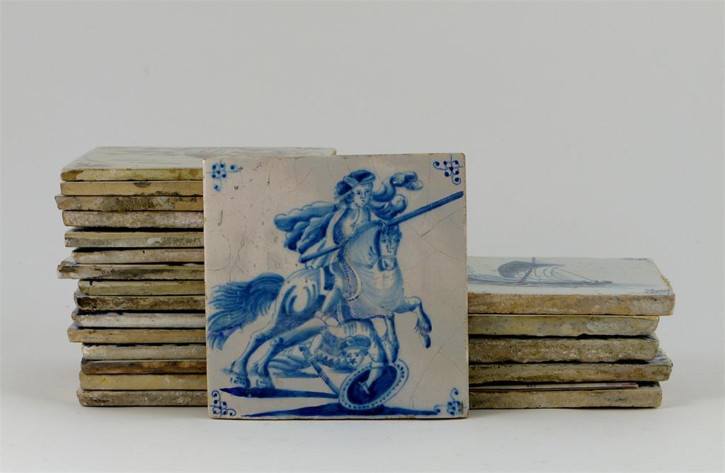 Twenty one Dutch and English Delft tiles, painted in blue and manganese with figures, buildings, animals and landscapes, 18th century and later, damages, 13.5cm. (21)