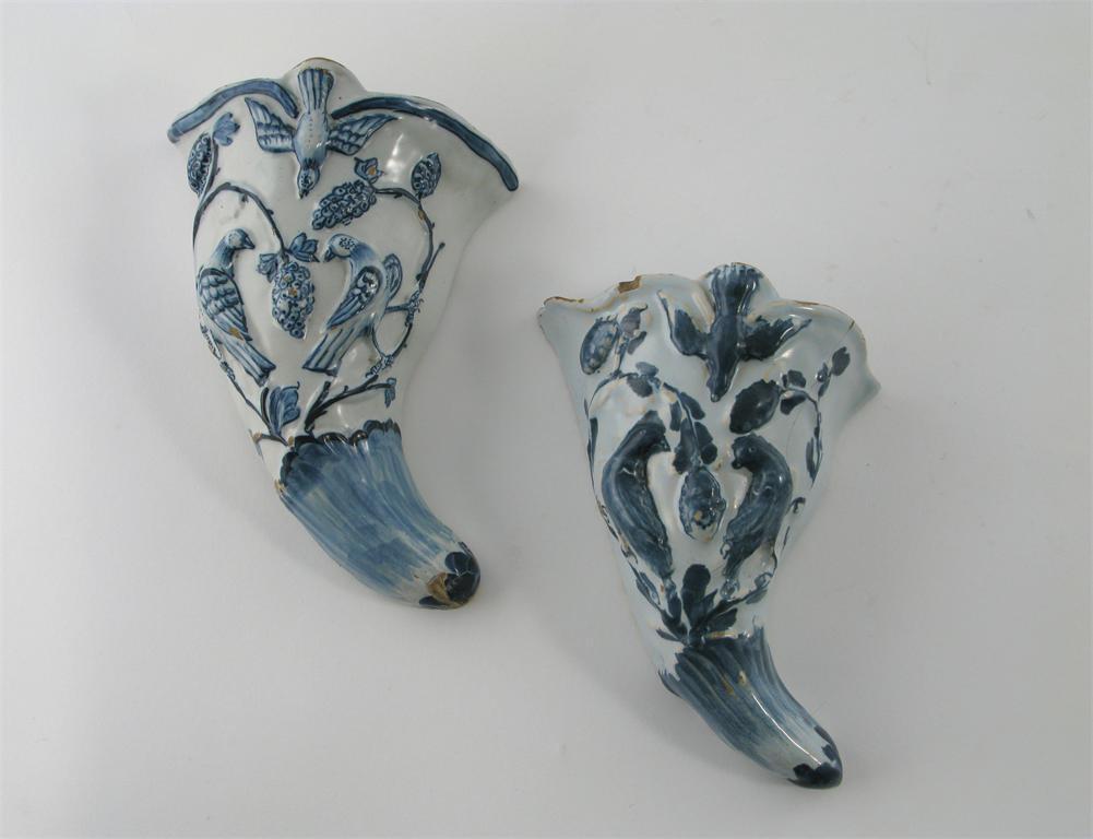 Two Delftware blue and white cornucopia-shaped wall pockets, Liverpool, moulded with three doves eating grapes off the vine, c.1750-60, some damage, 18.2cm max. (2)