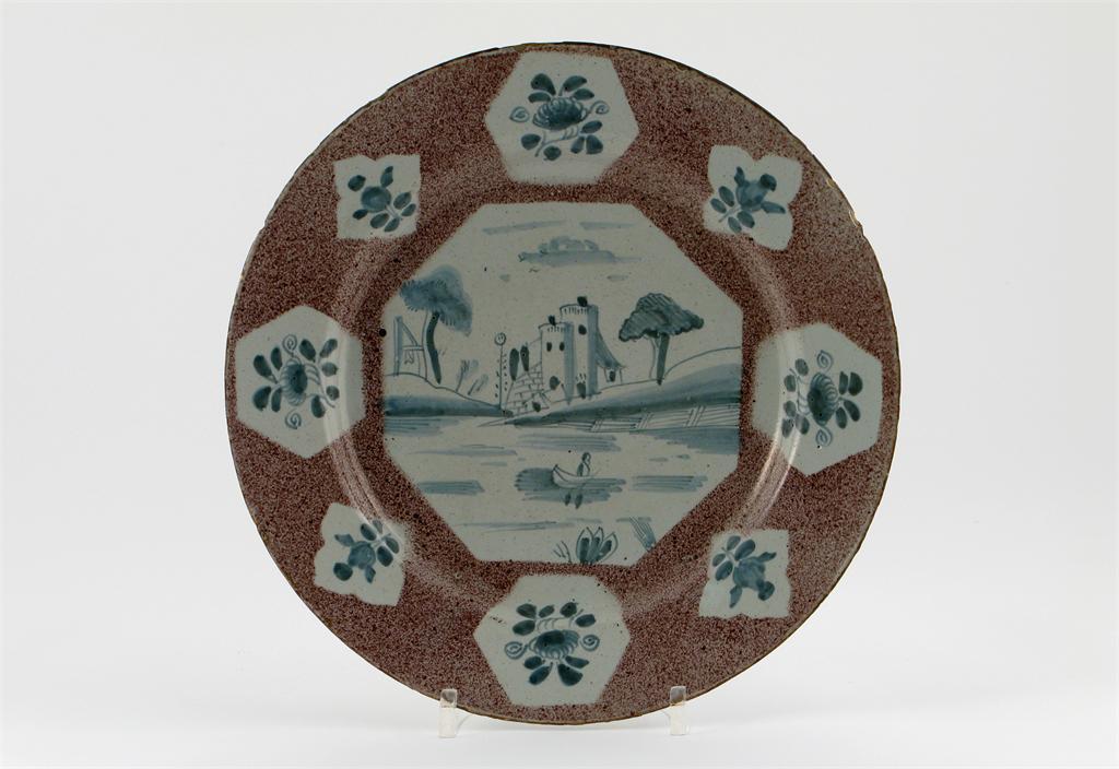 A Delftware plate, Wincanton or Bristol, on a powdered manganese ground, the well painted with a figure in a boat before a castle within an octagonal panel, the rim with eight smaller floral panels, c. 1740, minor glaze chips to the rim, 22.9cm.
