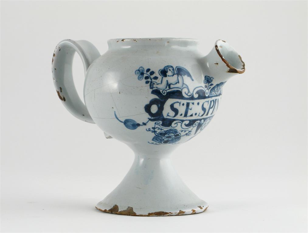 A small Delftware wet drug jar, painted in blue with the inscription 'S:E:Spin:Cerv' within a scrolling cartouche of cherubs, shells and floral motifs, with strapwork handle and raised on a flared foot, c.1730-50, minor chipping, 17.5cm. Cf. John C. Austin, British Delft at Williamsburg, p.228 pl.539 for a similar example.