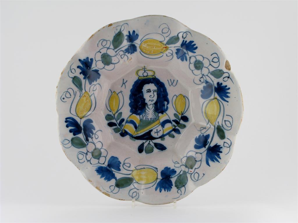 A lobed Delft dish, the well painted with a portrait of King William within a border of yellow flowers and foliage, late 17th / early 18th century, a short crack, minor rim chips, 34.5cm.