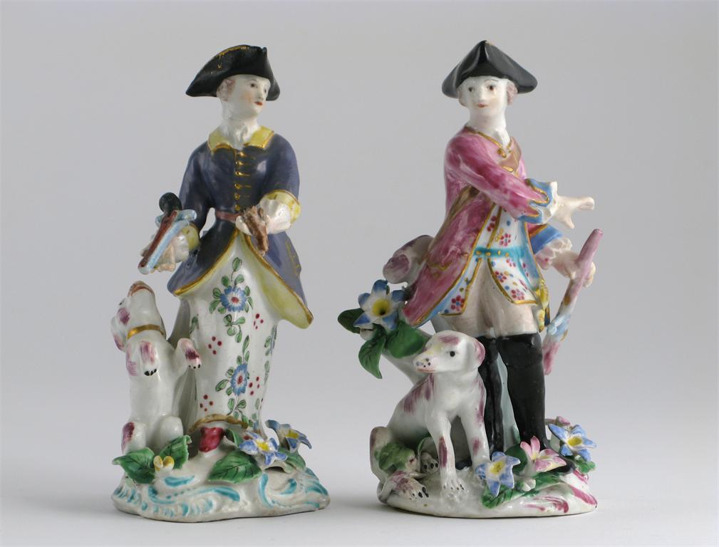 A near pair of Bow figures of a sportsman and his companion, each holding a gun with a dog seated beside them, raised on rococo moulded bases with applied flowers, c.1755, restoration to both, 13.5cm. (2) Cf. Elizabeth Adams & David Redstone, Bow Porcelain, p.199.