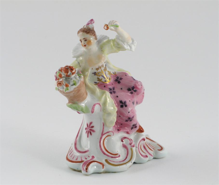 A Longton Hall figure of Spring, personified as a female flower seller, reclining against a scrolling base and wearing a ruffed cloak, c.1755, damage and restoration, 12cm. Cf. Bernard Watney, Longton Hall Porcelain, pl.37B.