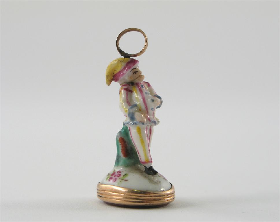 A Chelsea seal modelled as Punch, dressed in a striped costume, the seal underneath engraved with a blackbird holding a branch in its beak and the motto 'Ia l'aimie Liberte', probably for the Merle family, c.1765, the head broken off and reglued, 3.4cm.