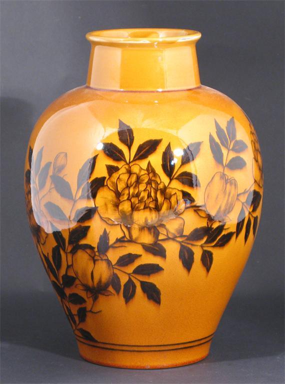 A large Linthorpe Pottery vase designed by Dr Christopher Dresser, shape no.496, shouldered form, printed in black with flower sprays on an ochre ground impressed marks, facsimile signature and Harry Tooth monogram 35cm. high