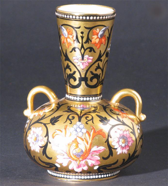 A Minton Aesthetic Movement twin-handled vase printed and painted with scrolling flowers and foliage