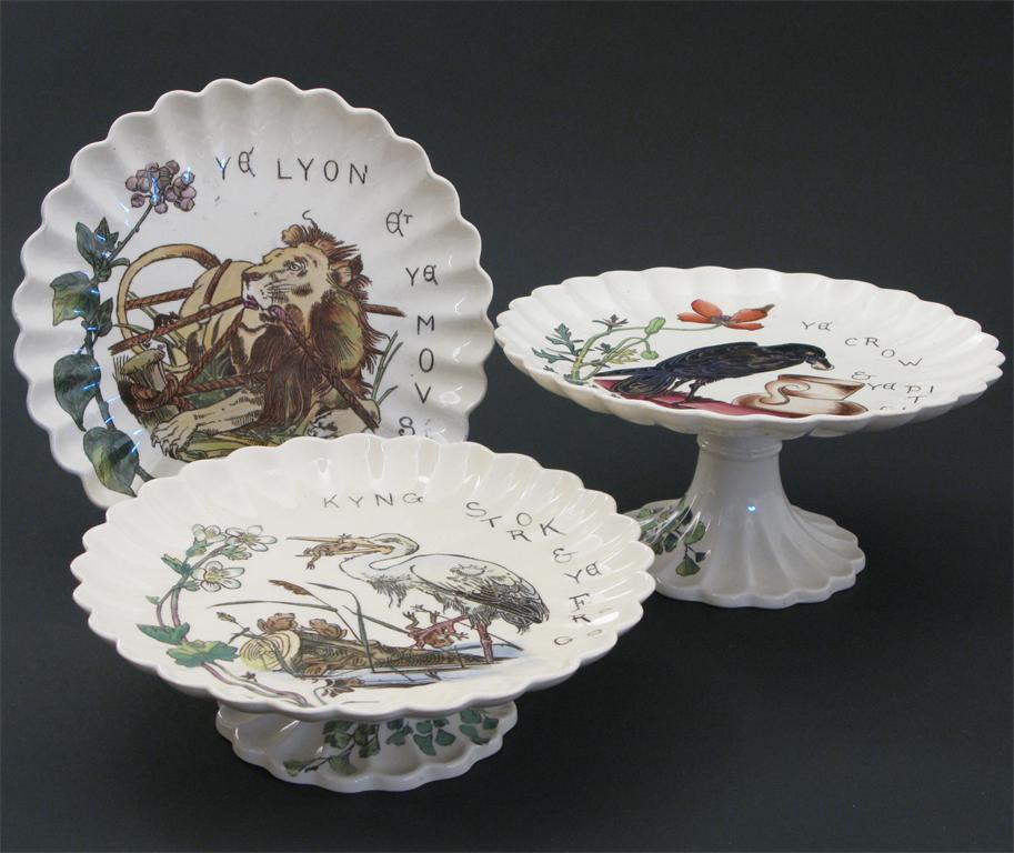 A Copeland Aesthetic Movement earthenware part dessert set fluted rims, printed and painted with Aesop's Fables, comprising; a tazza, two low tazza and four plates impressed marks, damages 21cm. diam.