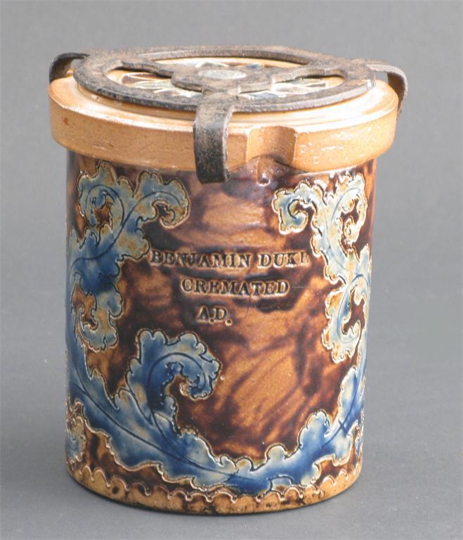 A humorous Doulton Lambeth stoneware tobacco jar and cover modelled as an ashes pot inscribed...