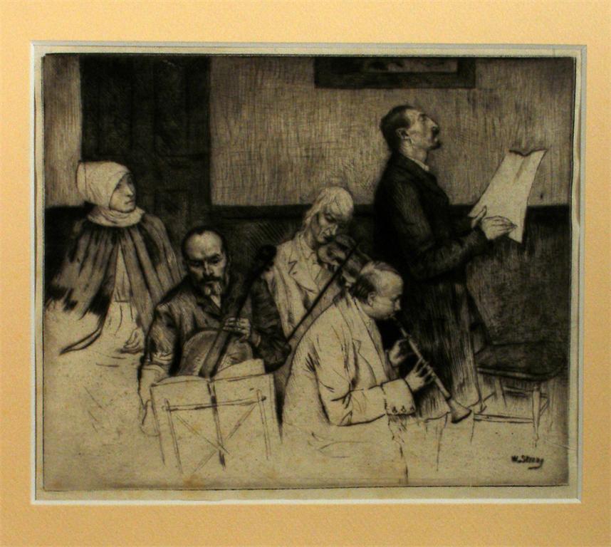 An etching of musicians by William Strang signed in the print image 21 x 17cm.