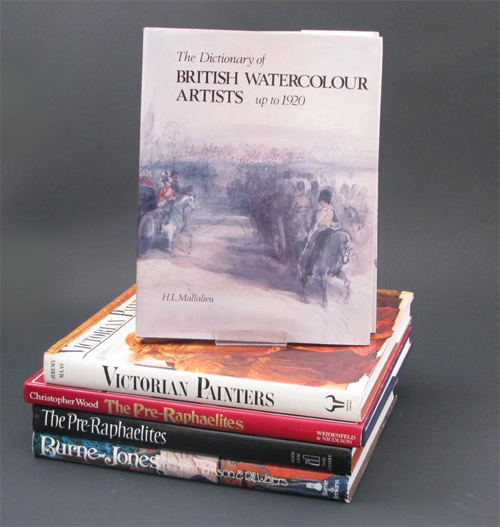 Five books on the Pre-Raphaelites and Victorian art comprising; The Pre-Raphaelties Tate Gallery, The Pre-Raphaelites by Christopher Wood, Victorian Painting by Jeremy Maas, The Dictionary of British Watercolour Artists up to 1920, and Burne-Jones by Martin Harrison and Bill Waters.