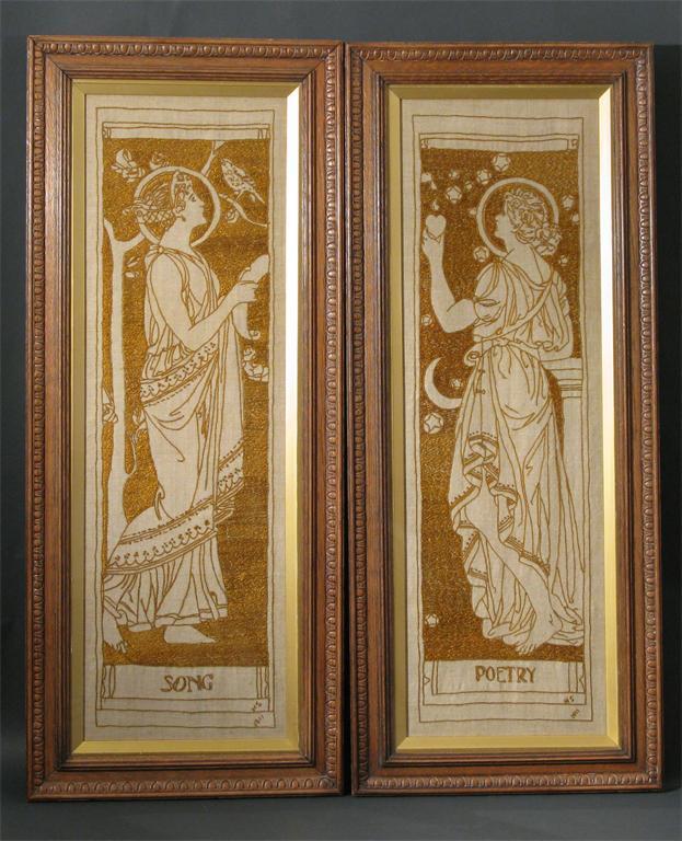 'Song' and 'Poetry' a pair of wool embroidered panels framed