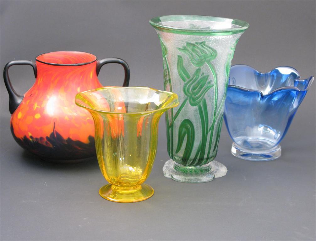 A Webb cameo glass vase flaring form, decorated with tulip flowers, and three other glass vases moulded signature, chipped foot 25cm. high