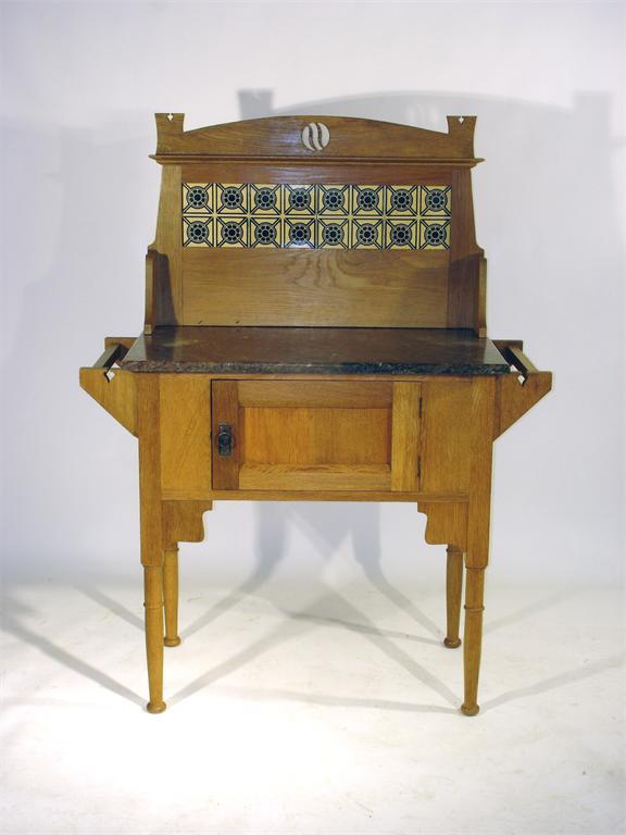 A Heals bleached oak washstand with marble top, the splashboard inset with Minton tiles unsigned 94cm. wide