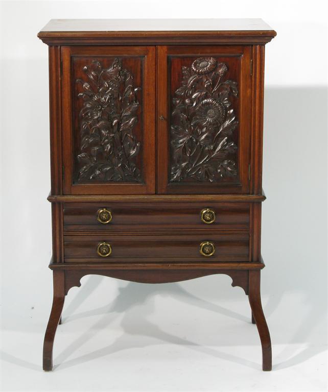 An Aesthetic Movement mahogany music cabinet two drawers below cupboard, the doors carved with sunflower panel unsigned 90cm. high