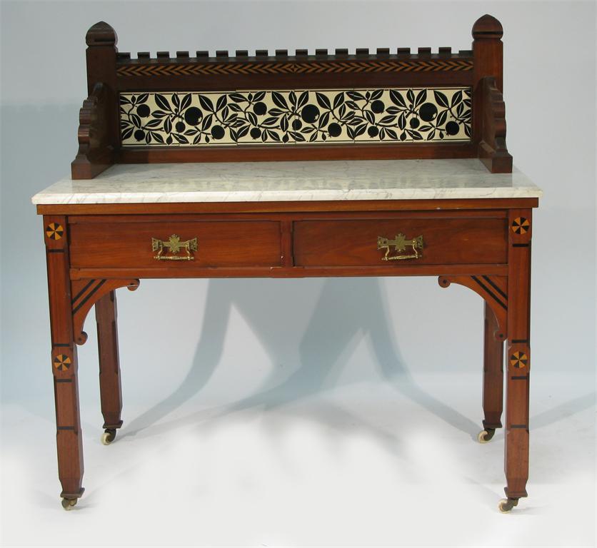 An inlaid mahogany wash stand in the style of Charles Bevan, with veined marble top and black fruit tiles probably Minton 110cm. wide