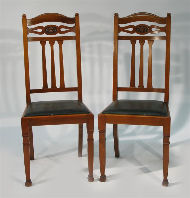 A Set of six dining chairs the back carved with simple flower design, leather seats unsigned 107cm. high