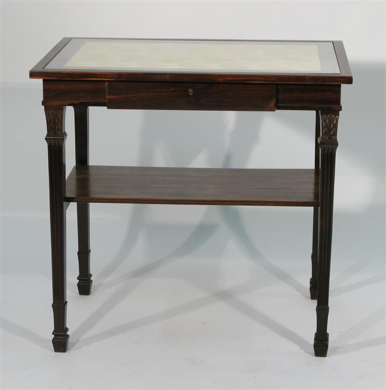 An ebony side table with drawer the glazed top inset with embroidered panel unsigned 73 x 75cm. long