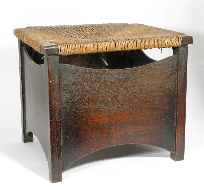 A Glasgow School rush seated stool square section with simple arched side panels 35cm. high