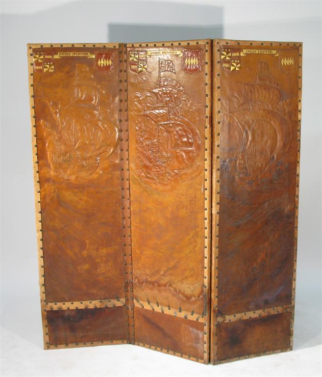 A tooled leather three fold screen by Ada Neville-Rolfe, each panel with a galleon at full sail, with tooled and gilded heraldic shields 163cm. high Provenance Ada Neville-Rolfe (1859-1963) thence by descent. Ada was niece to Harriet Jane Neville-Rolfe the painter