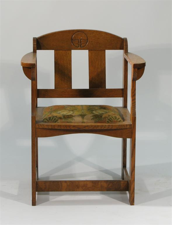 An oak armchair the design attributed to William Punnett, the back rest with incised flower roundel, architectural form with textile seat, unsigned 86cm. high