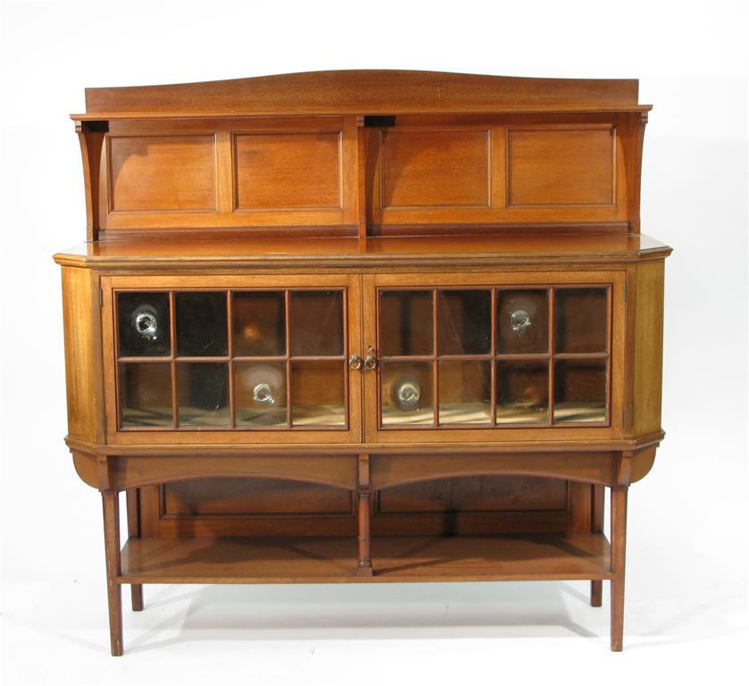 A Liberty & Co mahogany sideboard two central glazed doors, on four turned legs applied label 133cm wide, 128cm. high