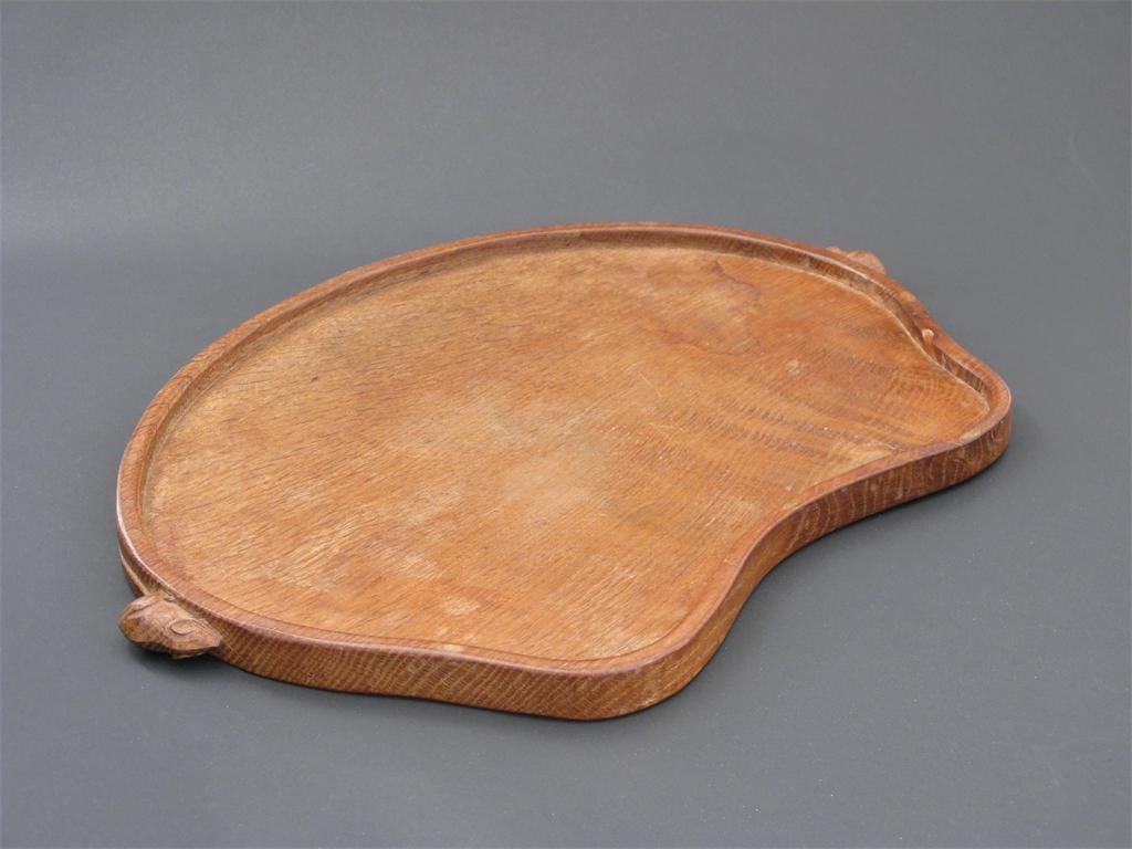 A Robert Mouseman Thompson oak tray kidney shaped, with two carved mice to the rim 48cm. wide