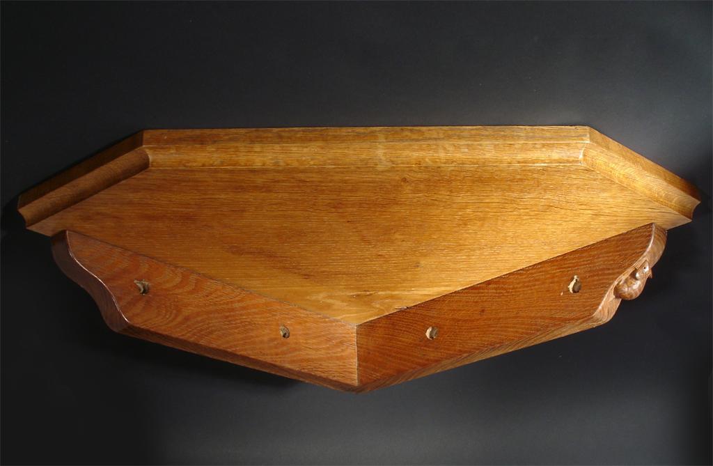 A Robert Mouseman Thompson oak corner shelf with carved mouse signature 64.5cm. wide