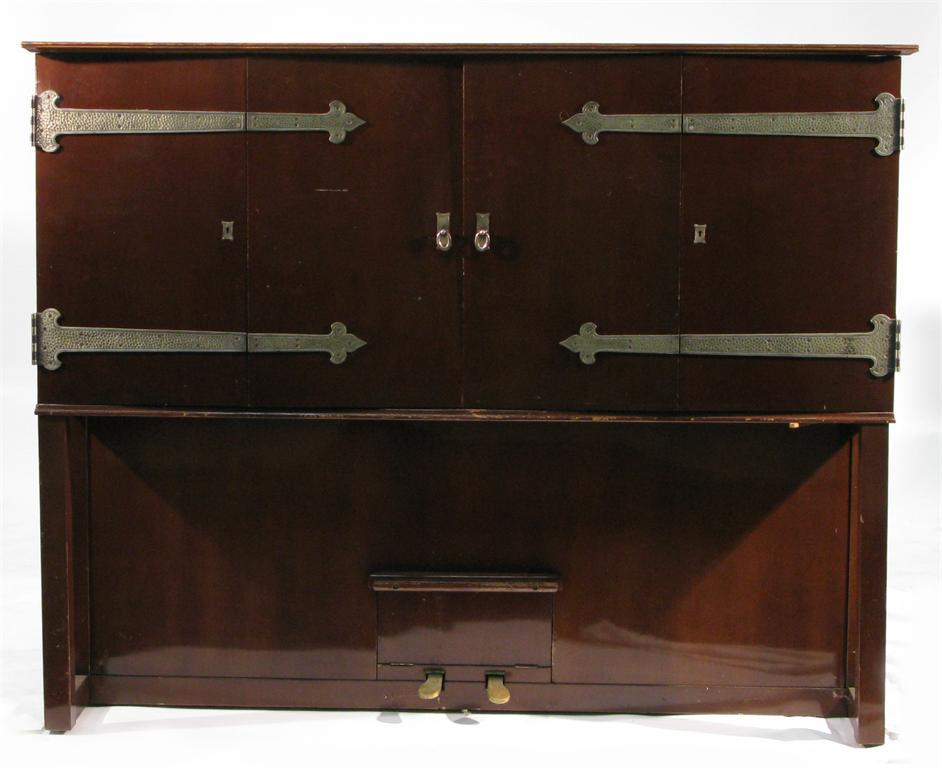 A Ronisch mahogany and sycamore upright pianola possibly designed by Mackay Hugh Baillie Scott, with hammered steel furniture applied factory label 162cm. wide, 130cm. high Literature Fine 20th Century Design, Sotheby's London 2nd April 2008, lot 153 page 166-167 for a comparable Ronisch piano designed by Mackay Hugh Baillie Scott.