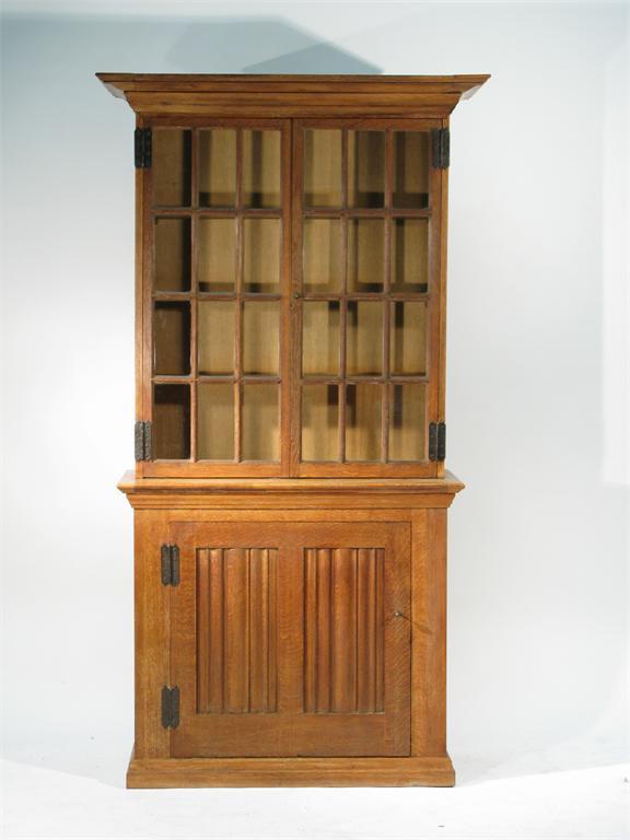 A limed oak bookcase designed by Charles Francis Annesley Voysey, for J Horniman, with carved fluted panel and brass fittings by Elsey & Co, sold with a photograph of the original plans