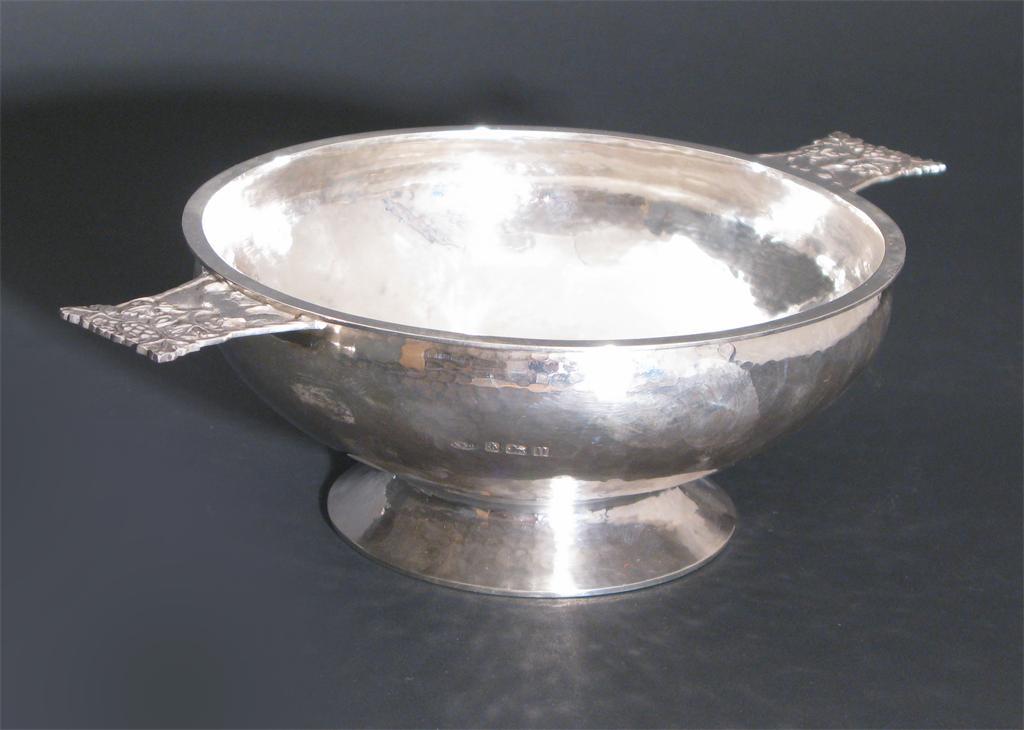 An A.E.Jones silver quaiche model no.478, footed form, the hammered bowl with twin-handles cast with fox and vine motif stamped marks, Birmingham 1919, Connell, 33 Cheapside 26cm. wide