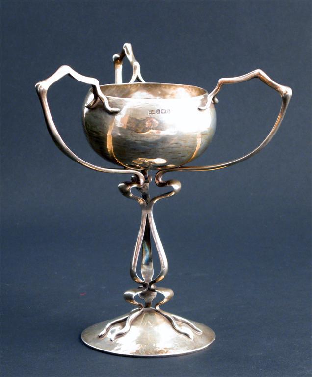 A Mappin & Webb silver cup hammered domed foot supporting tripod stem rising to three handles