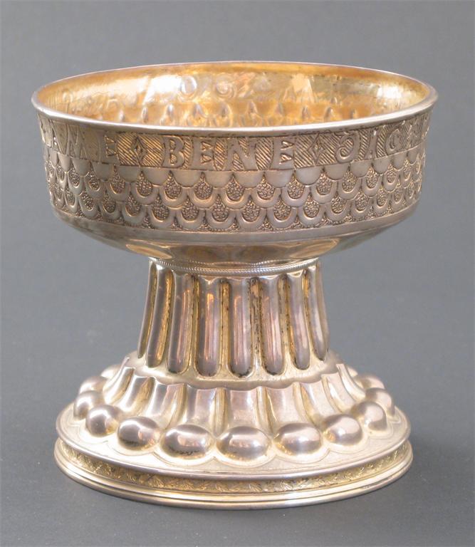 A Nathan & Hayes silver gilt Medieval Revival chalice decorated with bands of geometric designs, below inscription to the rim, inscription to well stamped marks, Chester 1909 11cm. high