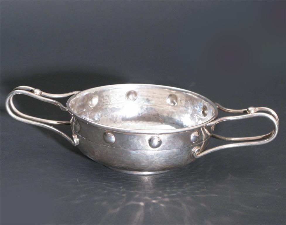 An A.E.Jones silver twin-handled porringer wirework handles with ball decoration