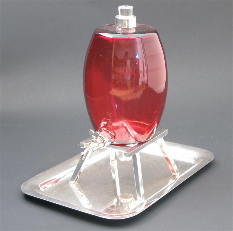 A Hukin & Heath electroplate and cranberry glass drinks decanter model no.1371, in the form of a barrel on stand and rectangular drip tray stamped marks 30cm. high