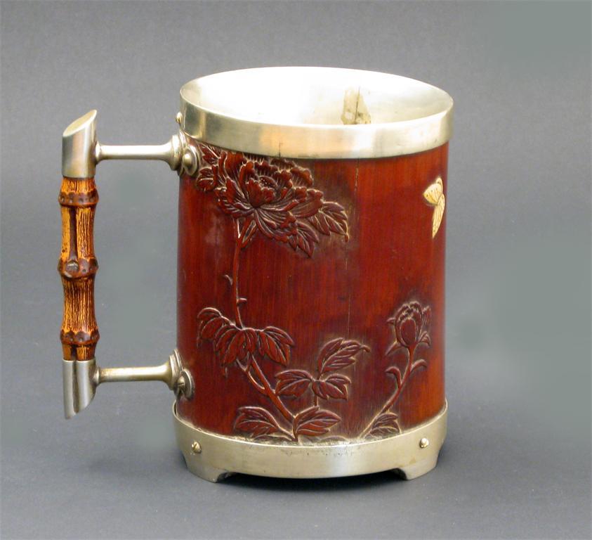 An interesting Hukin & Heath electroplate mounted bamboo mug with rod construction bamboo handle stamped marks 14cm. high Literature Michael Whiteway Christopher Dresser, a Design Revolution, V&A page 131 figure 163 for a reproduction of a comparable Japanese Art Metal-work tankard imported by Dr Christopher Dresser for Dresser & Holme, illustrated in the Furniture Gazette 1880.