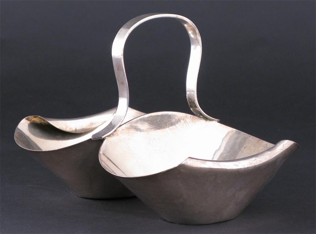 A Roberts and Belk electroplated sweet-meat dish designed by Dr Christopher Dresser, model no.2700, twin compartment with central loop handle stamped marks 21cm. wide