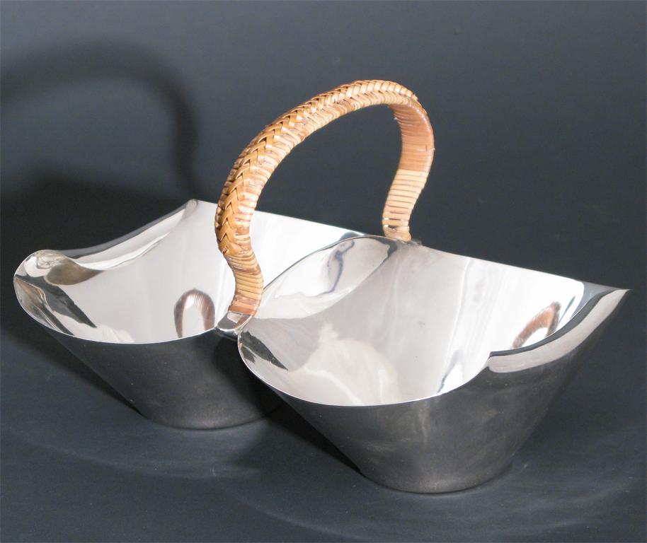 An Elkington electroplate twin bowl dish designed by Dr Christopher Dresser, model no.17618, with wicker bound central handle stamped marks 20cm. wide