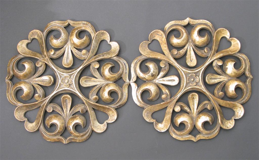 A pair of carved wood roundels pierced design of fleur de lys, gilded unsigned 30.5cm. diam.