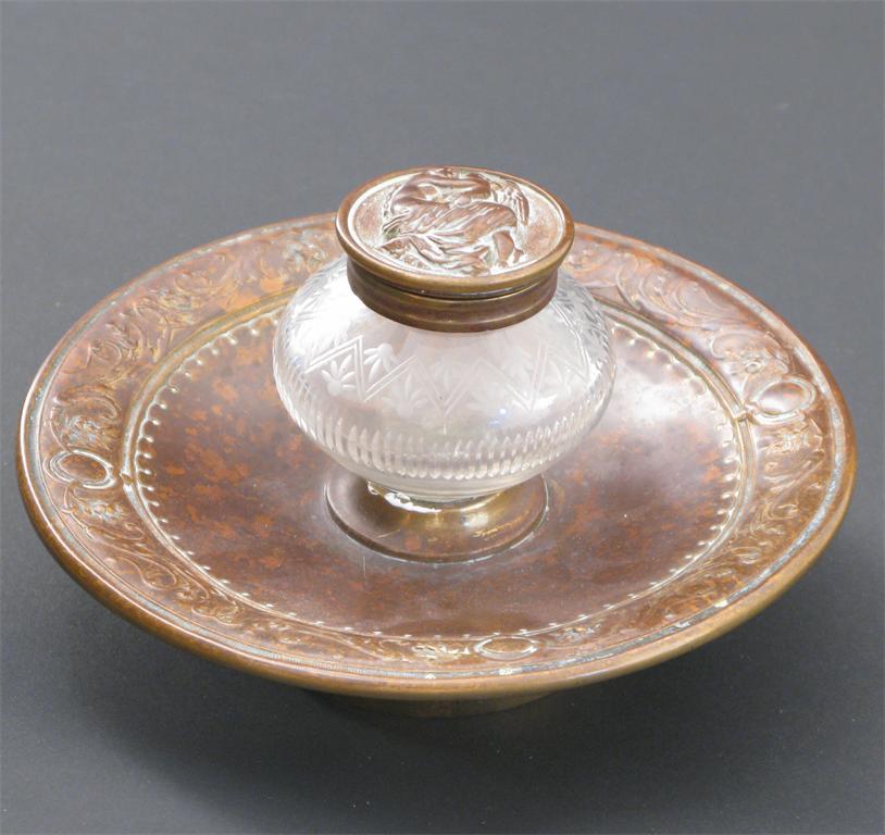 An Elkingtons Art Gold Bronze inkwell with ovoid glass well and hinged cover, cast mark to base 14cm. diam.