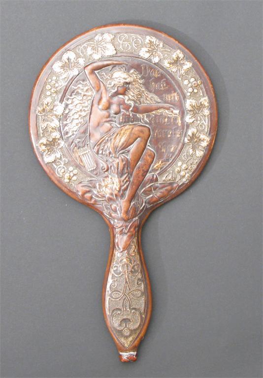 A gilded leather hand mirror decorated in low relief with a maiden, inside grape and leaf border unsigned 26cm. long