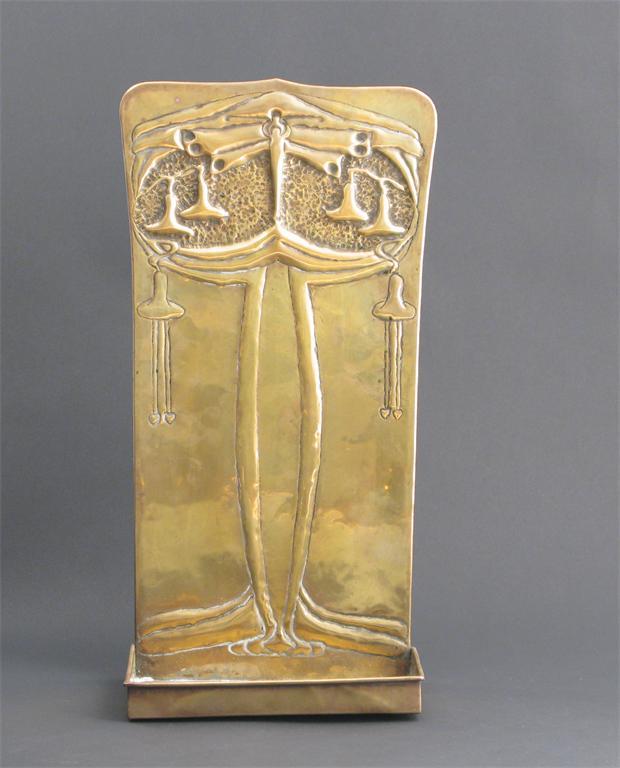 A large Scottish brass wall shelf hammered in relief with pendulous bell flowers unsigned 42.5cm....